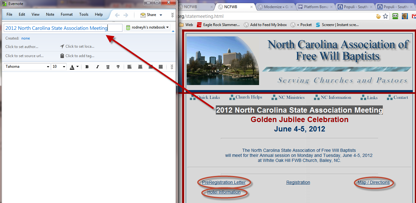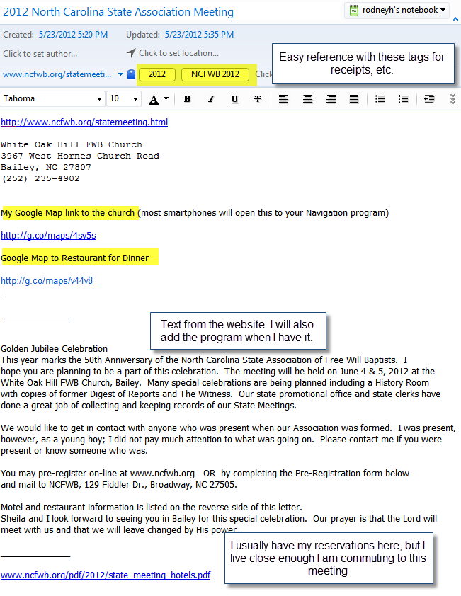 2. I will normally have one note ready to take down outlines, make a note to call someone, send a card, etc. This allows me to have something other than my memory to help make the meeting more profitable. Also, for the last several years, I have tried to give a short report to the church where I serve concerning the church planting that is ongoing in North Carolina. Evernote makes this a piece of cake as I am taking down facts and information while I am there so there is no problem with recall.